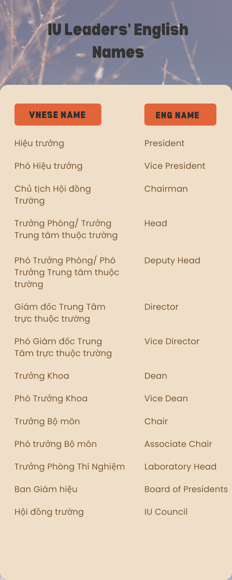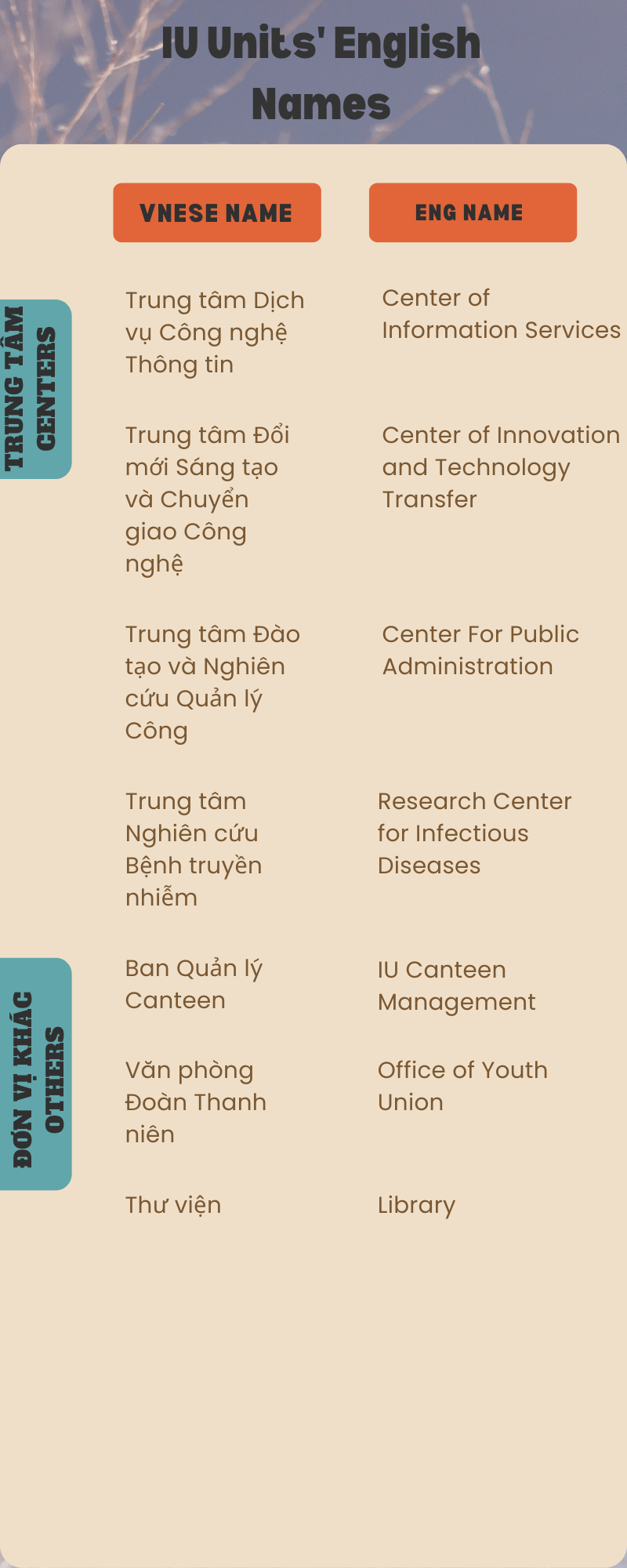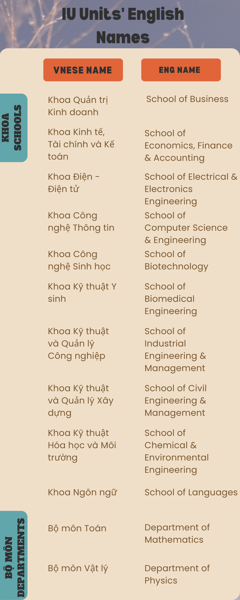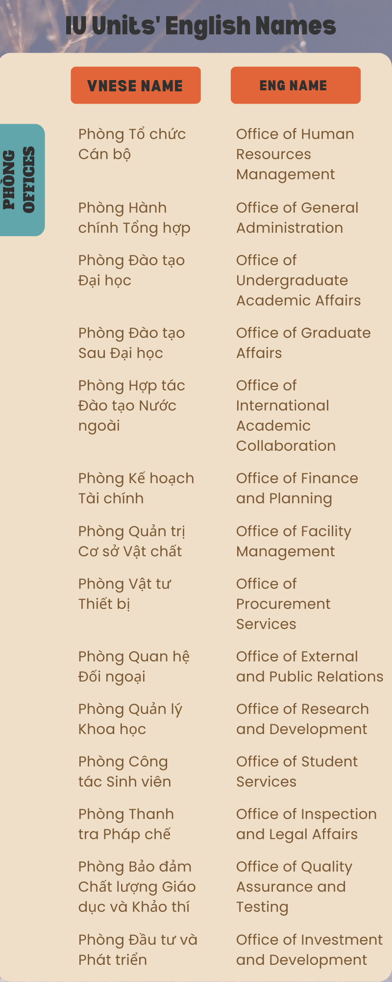Danh sách tên tiếng Anh của Ban Lãnh đạo và các đơn vị thuộc trường Đại học Quốc tế như sau:
